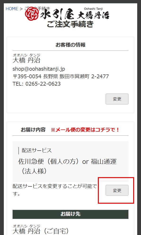 2.「お客様の情報」の下の「お届け内容」の変更ボタンをクリックします。
