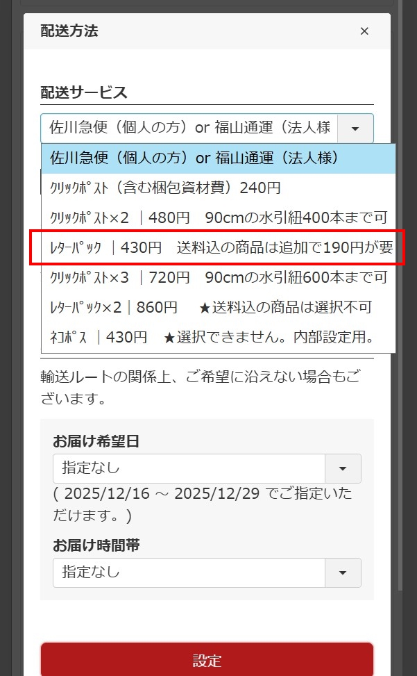 ↑の設定ボタンを押せば、レターパックへ変更ができます。