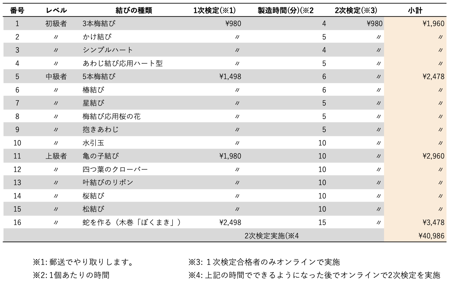 | 番号 | レベル | 結びの種類 | 1次検定(※1) | 製造時間(分)(※2) | 2次検定(※3) | 小計 |