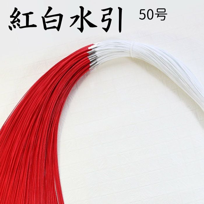 色水引※1を紅白(赤白)に染め分けたものを、真ん中で留めた(中付した)水引素材です。