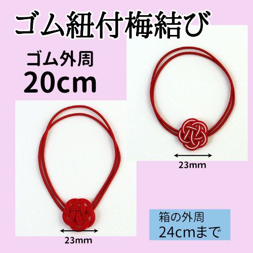 その3:商品の箱等にちょうど良いゴムの長さがない場合はご自身での取付も可能!弊社で在庫しているゴム付の梅結びの円周は、20cm、34cm、40cm、50cmの4種類。 |